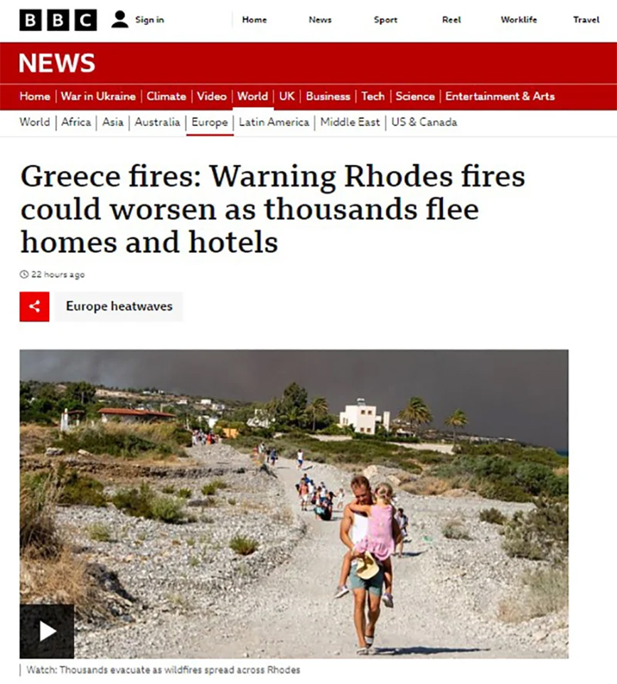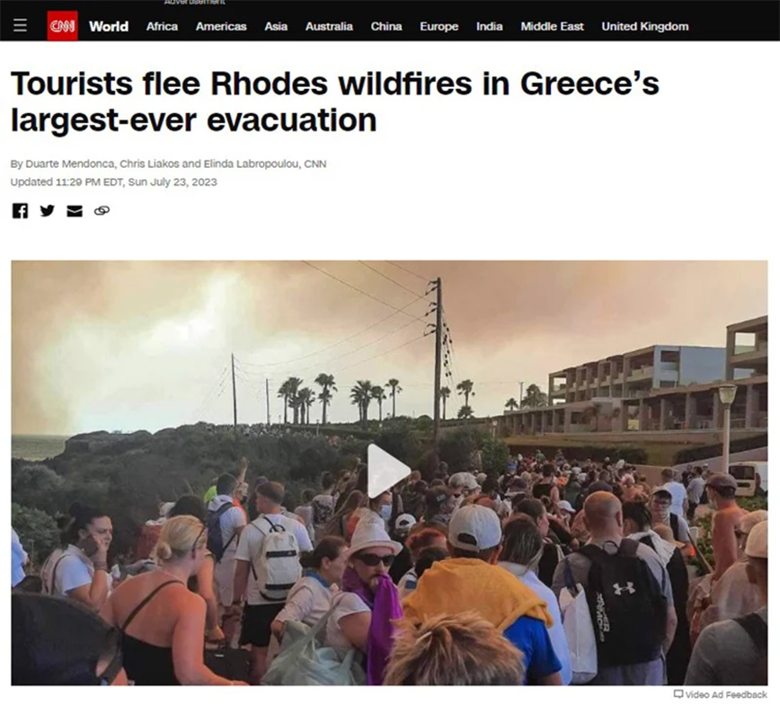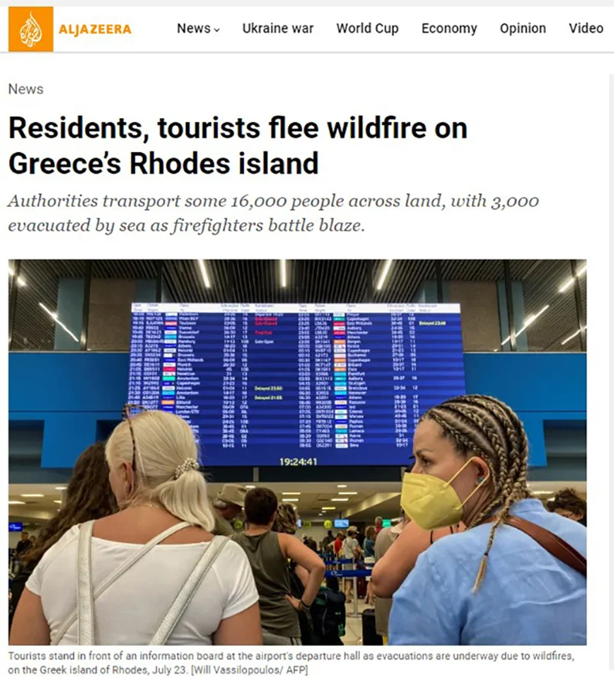 To Aljazzera σημειώνει: «Κάτοικοι και τουρίστες έχουν εγκαταλείψει τα καυτά σημεία του ελληνικού νησιού της Ρόδου, καθώς οι πυροσβέστες, με την υποστήριξη οχημάτων πυρόσβεσης, χρησιμοποιώντας πίδακες νερού και ελικοπτέρων, μάχονται με τη φωτιά που πυροδότησε τη μεγαλύτερη εκκένωση πυρκαγιάς στη χώρα».