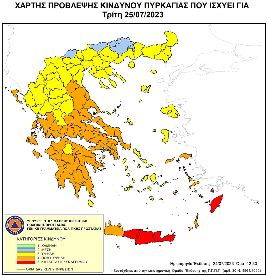 Σύμφωνα με το Χάρτη Πρόβλεψης Κινδύνου Πυρκαγιάς που εκδίδει η Γενική Γραμματεία Πολιτικής Προστασίας του Υπουργείου Κλιματικής Κρίσης και Πολιτικής Προστασίας για αύριο Τρίτη 25 Ιουλίου 2023, προβλέπεται:
