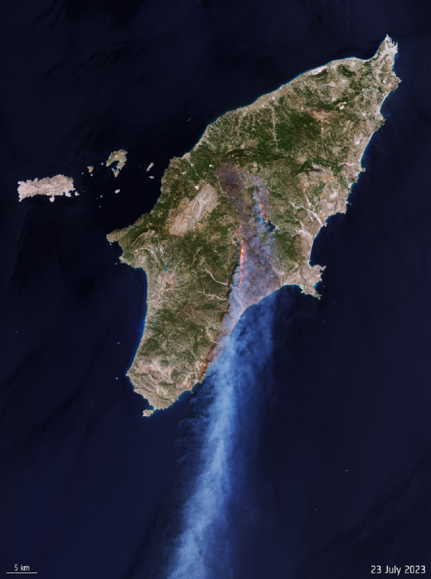 Η Ευρωπαϊκή Υπηρεσία Διαστήματος (ESA) έδωσε στη δημοσιότητα μια φωτογραφία τραβηγμένη από δορυφόρο, η οποία αποκαλύπτει το μέγεθος της καταστροφής από τη φωτιά στη Ρόδο.