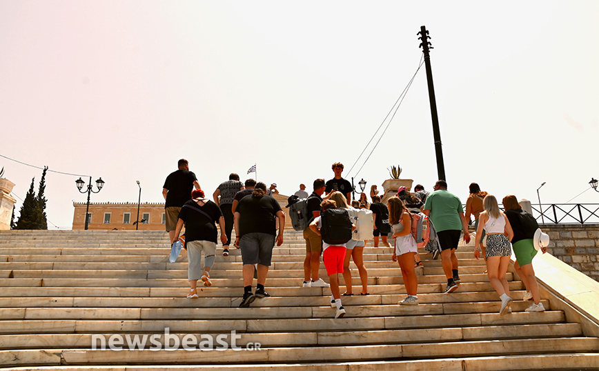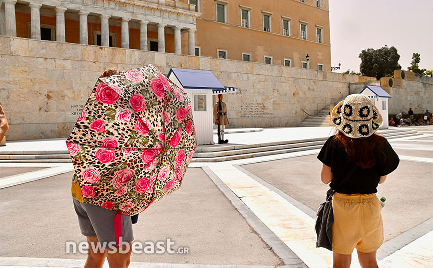 Και ενώ θα περίμενε κανείς πως η Αθήνα θα ήταν άδεια λόγω του καύσωνα, τουρίστες και πολίτες δεν πτοούνται. Ορισμένοι ψάχνουν ανάσες δροσιάς στην πλατεία Συντάγματος.