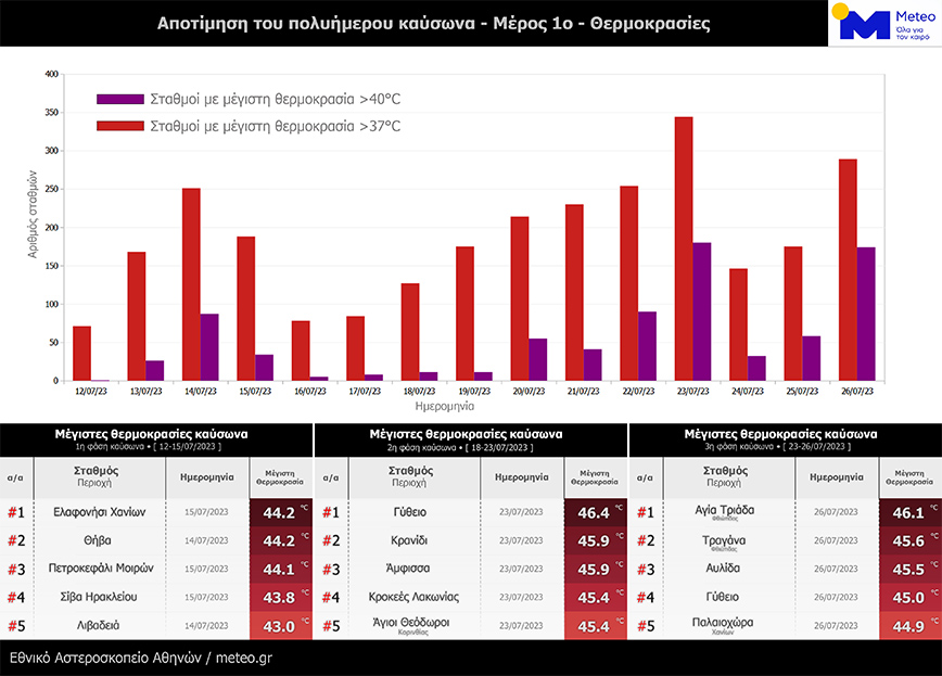 Στο διάγραμμα που ακολουθεί, σύμφωνα με τις καταγραφές του δικτύου αυτόματων μετεωρολογικών σταθμών του Εθνικού Αστεροσκοπείου Αθηνών/ Meteo.gr, παρουσιάζεται ο αριθμός των σταθμών όπου η θερμοκρασία ξεπέρασε τους 37 °C και τους 40 °C (κόκκινες και μωβ μπάρες, αντίστοιχα). Στο διάγραμμα διακρίνονται τρεις φάσεις: