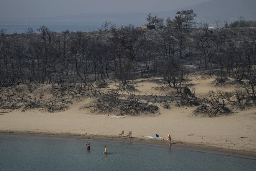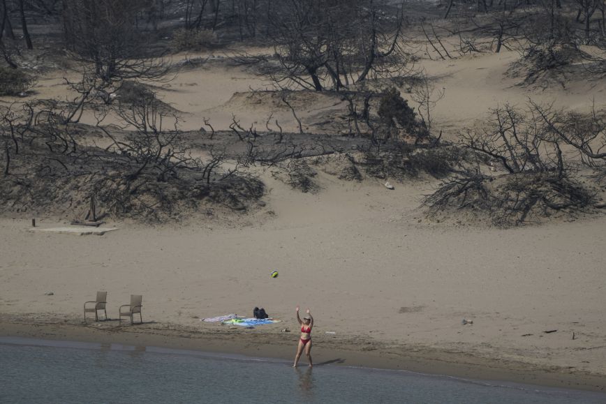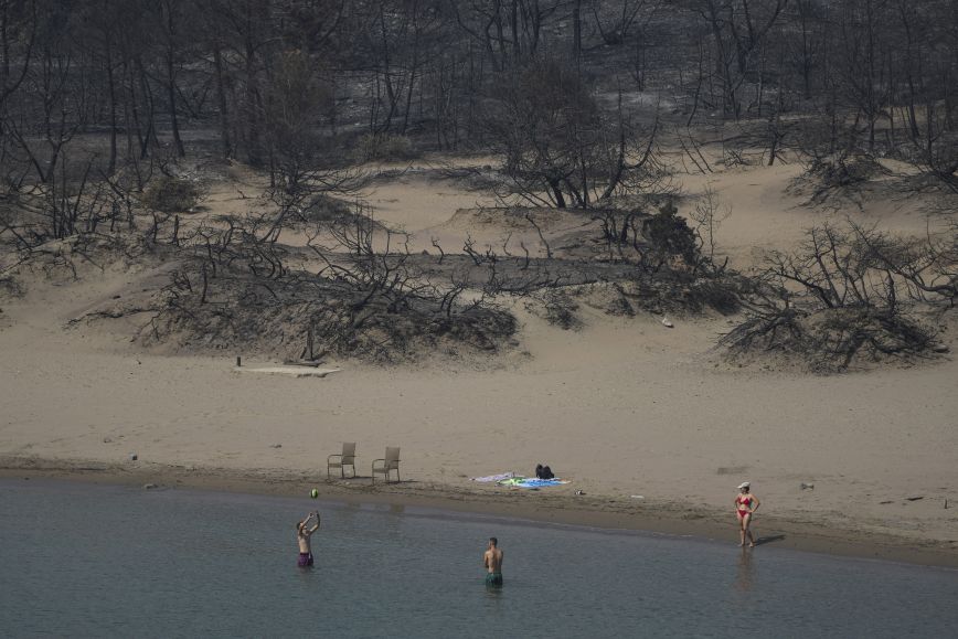 Νεαρά παιδιά βρίσκονται στην παραλία κοντά στο χωριό Γεννάδι το οποίο έγινε στάχτη. Η πανέμορφη βλάστηση του χωριού το οποίο ήταν γεμάτο δέντρα, πεύκα και θάμνους παραδόθηκε στις φλόγες και τη θέση τους έχει πάρει ένα μουντό τοπίο «ζωγραφισμένο» με καφέ και μαύρο χρώμα.