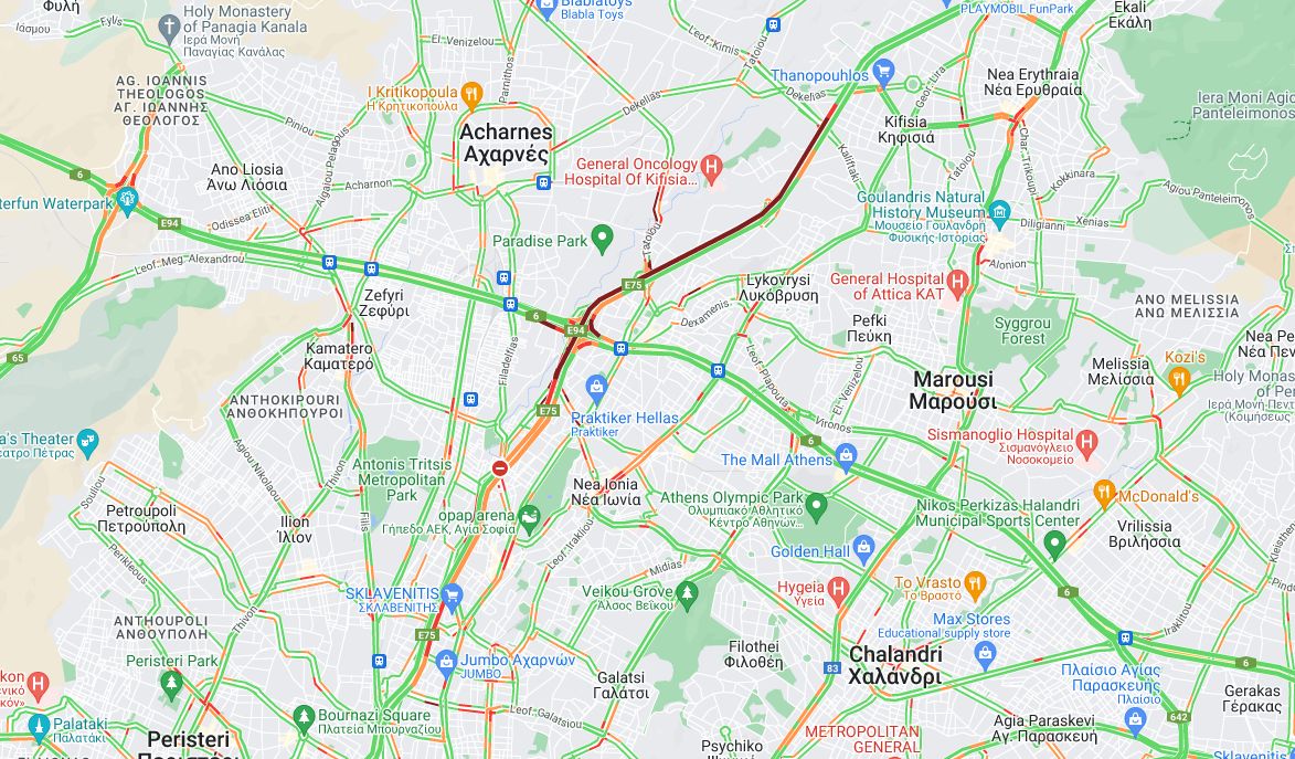 Το μεσημέρι της Τρίτης (08/01) η κίνηση και στα δυο ρεύματα, ειδικά προς Πειραιά, πραγματοποιείται με μεγάλη δυσκολία. Στο ρεύμα προς Πειραιά οι καθυστερήσεις ξεκινούν από το ύψος της γέφυρας Καλυφτάκη ενώ στο ρεύμα προς Λαμία από το ύψος της Αχαρνών.