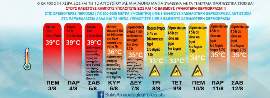 Τις θερμοκρασίες στη χώρα μας μέχρι και τις 12 Αυγούστου παρουσιάζει σε έναν πίνακα που ανάρτησε στη σελίδα του στο Facebook ο μετεωρολόγος της ΕΡΤ, Σάκης Αρναούτογλου. Οι πιο θερμές ημέρες φαίνεται πως είναι το τριήμερο Πέμπτη με Σάββατο, με τη θερμοκρασία να αγγίζει τους 39 βαθμούς.