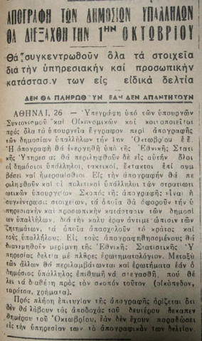 Αν πιστεύετε ότι η απογραφή των δημοσίων υπαλλήλων είναι νέα είδηση μάλλον η ιστορία θα σας διαψεύσει. Για του λόγου του αληθές υπάρχει σχετικό δημοσίευμα του 1956 που μιλάει για την απογραφή και ό,τι αυτή συνεπάγεται. Η ελληνική ιστορία, κύκλους κάνει…