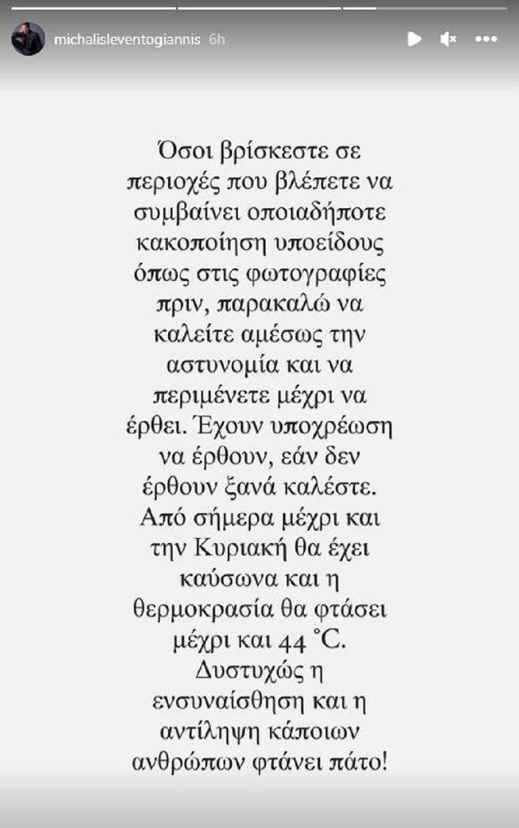 «Όσοι βρίσκεστε στις περιοχές που βλέπετε να συμβαίνει οποιαδήποτε κακοποίηση υποείδους όπως στις φωτογραφίες πριν, παρακαλώ να καλείτε αμέσως την αστυνομία και να περιμένετε μέχρι να έρθει. Έχουν υποχρέωση να έρθουν, εάν δεν έρθουν ξανά καλέστε. Από σήμερα μέχρι και την Κυριακή θα έχει καύσωνα και η θερμοκρασία θα φτάσει μέχρι και τους 44 βαθμούς. Δυστυχώς η ενσυναίσθηση και η αντίληψη κάποιων φτάνει πάτο», έγραψε στην ανάρτησή του ο πρωταγωνιστής της σειράς «Παγιδευμένοι».