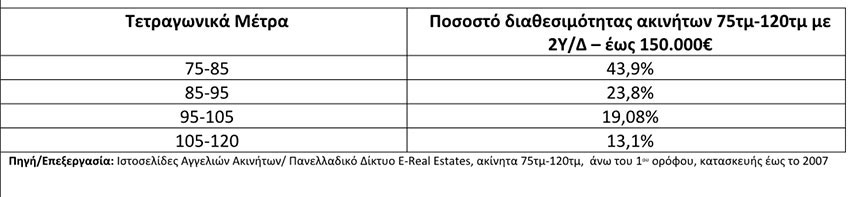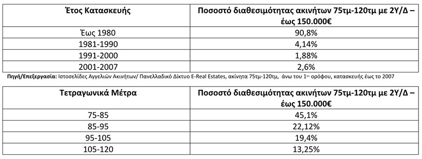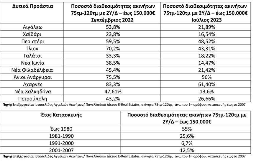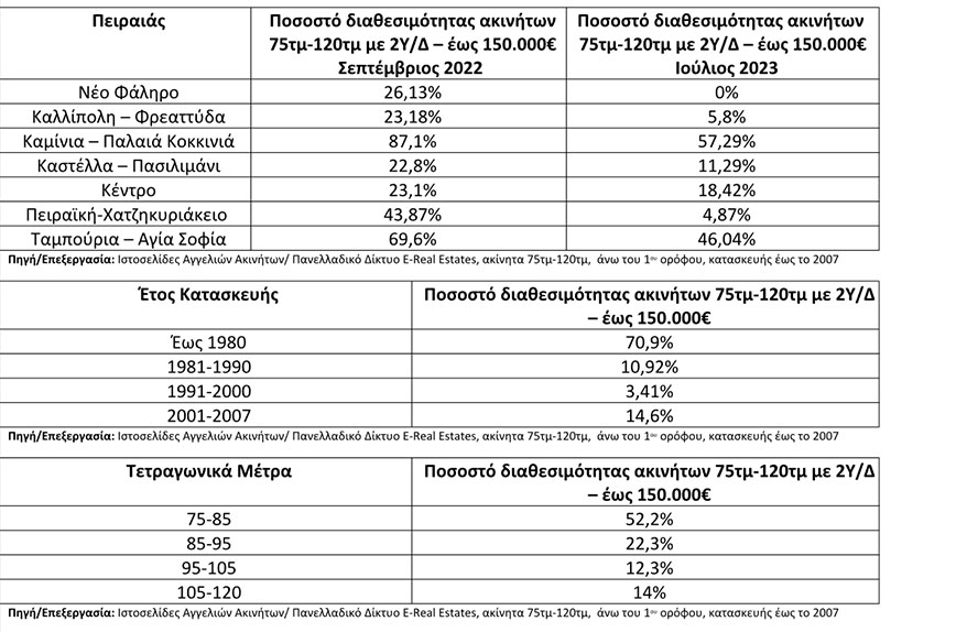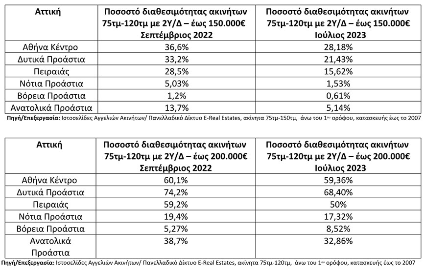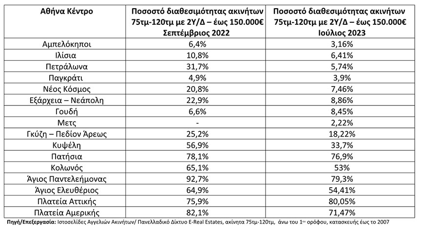 Τον Σεπτέμβριο του 2022, στις περιοχές του κέντρου των Αθηνών μόλις 3 στις 10 κατοικίες (36,6%), από 75τμ έως 120τμ, άνω του 1 ου ορόφου, με 2Υ/Δ, με έτος κατασκευής έως το 2007, διατίθενταν προς πώληση με ζητούμενη τιμή έως 150.000€. Σήμερα, λιγότερο από 3 στις 10 κατοικίες.