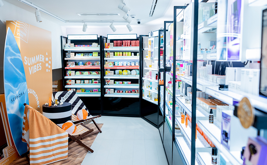 Mε moto της εκδήλωσης το “SUMMER VIBES” που πάντα θα μας θυμίζει τις ηλιόλουστες ημέρες του καλοκαιριού, η SEPHORA καλωσόρισε τους καλεσμένους της σε έναν υπερσύγχρονο χώρο 350 τμ που συνδυάζει την δυναμικότητα και την ηρεμία σε μία ενιαία αισθητική. Στο κατάστημα κυριαρχούν τα λευκά & γήινα, χρώματα που αντανακλούν το φως, ενώ, ταυτόχρονα, τα γραμμικά στοιχεία (lighting design, signage) προσδίδουν στη συνολική σύνθεση κινητικότητα και ροή. Η πρόσοψη εισάγει δυναμικά τον επισκέπτη στον χώρο, διατηρώντας παράλληλα τα αρχιτεκτονικά χαρακτηριστικά του brand.