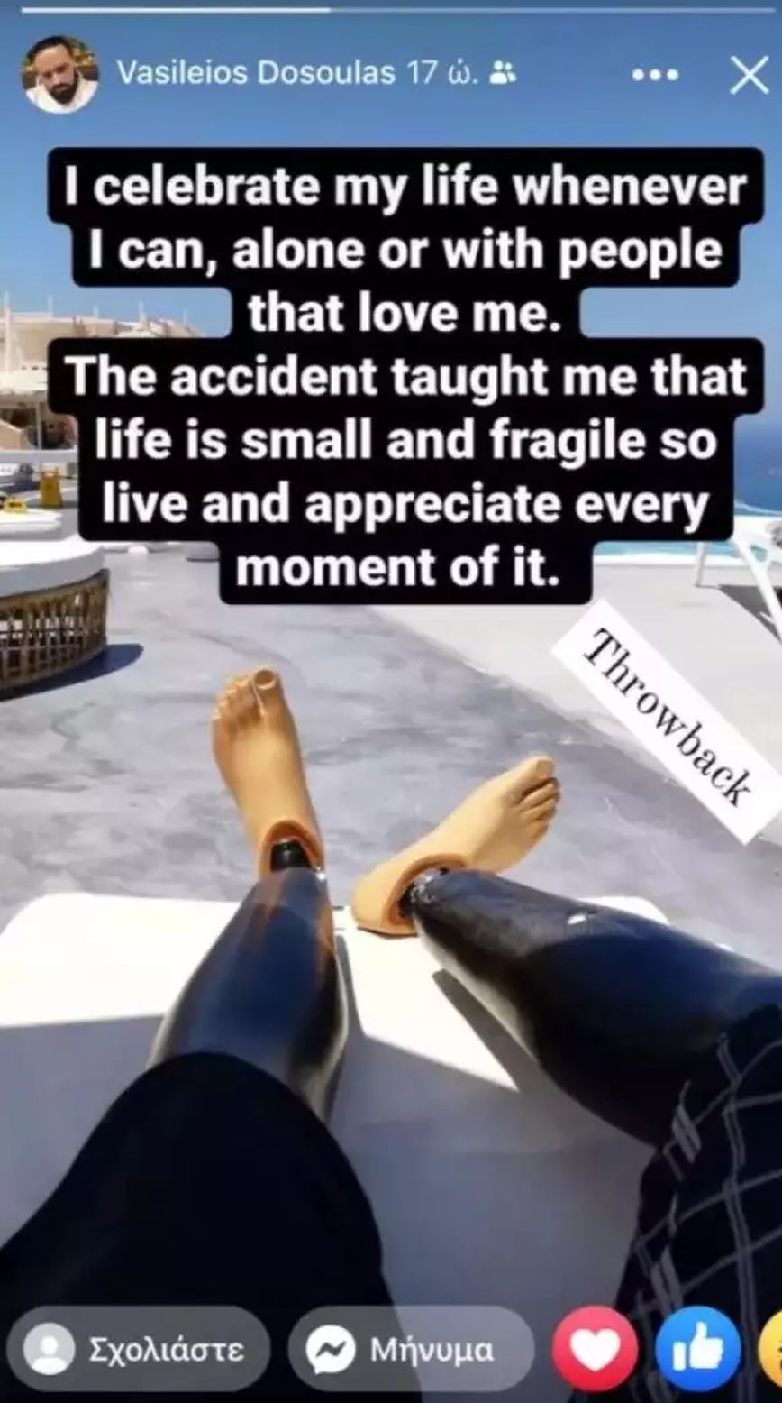 Σε μια συγκλονιστική ανάρτηση προχώρησε ο Βασίλης Δοσούλας και παραδίδει μαθήματα ζωής, 29 χρόνια μετά το τραγικό ατύχημα το οποίο οδήγησε στον ακρωτηριασμό και των δύο ποδιών του.