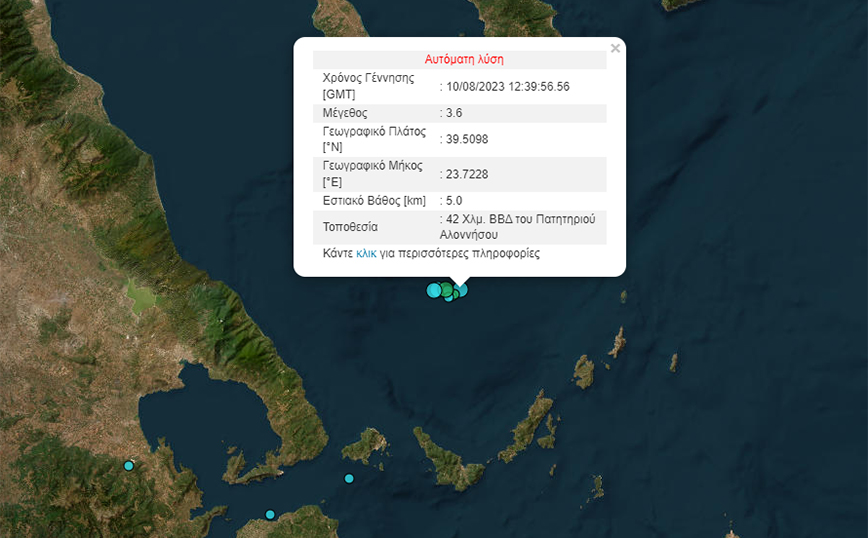Σεισμός σημειώθηκε ανοιχτά της Αλοννήσου. Η σεισμική δόνηση ήταν μεγέθους 3,6 Ρίχτερ σύμφωνα με τη λύση του Γεωδυναμικού Ινστιτούτου του Εθνικού Αστεροσκοπείου Αθηνών.