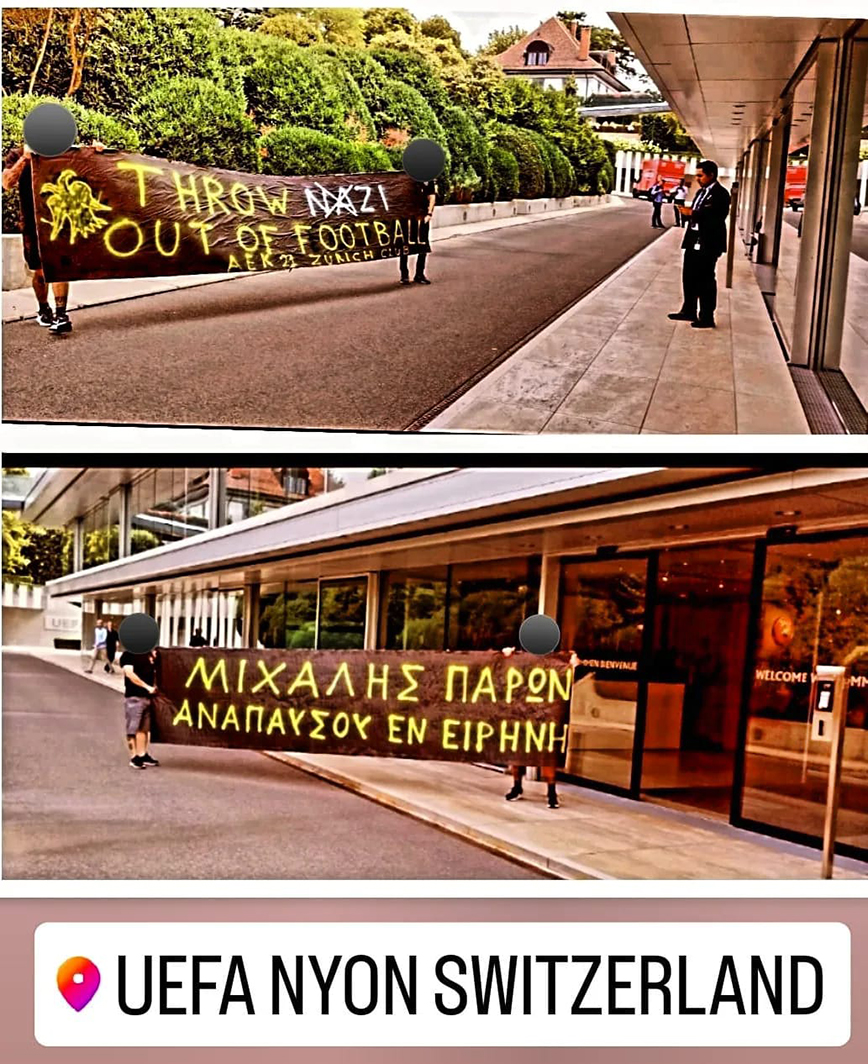 «Οι οπαδοί της ΑΕΚ από το club της Ζυρίχης πήγαν να εκφράσουν την αντίδραση τους προς την ΟΥΕΦΑ. Ως ελάχιστη κίνηση διαμαρτυρίας αναρτήθηκε πανό έξω από τα κεντρικά γραφεία της #uefa για τη μνήμη του ΜΙΧΑΛΗ μας που έφυγε τόσο άδικα! Η αγάπη και η λατρεία για την ΑΕΚΑΡΑ μας θα κερδίζει πάντα το φόβο και το μίσος.