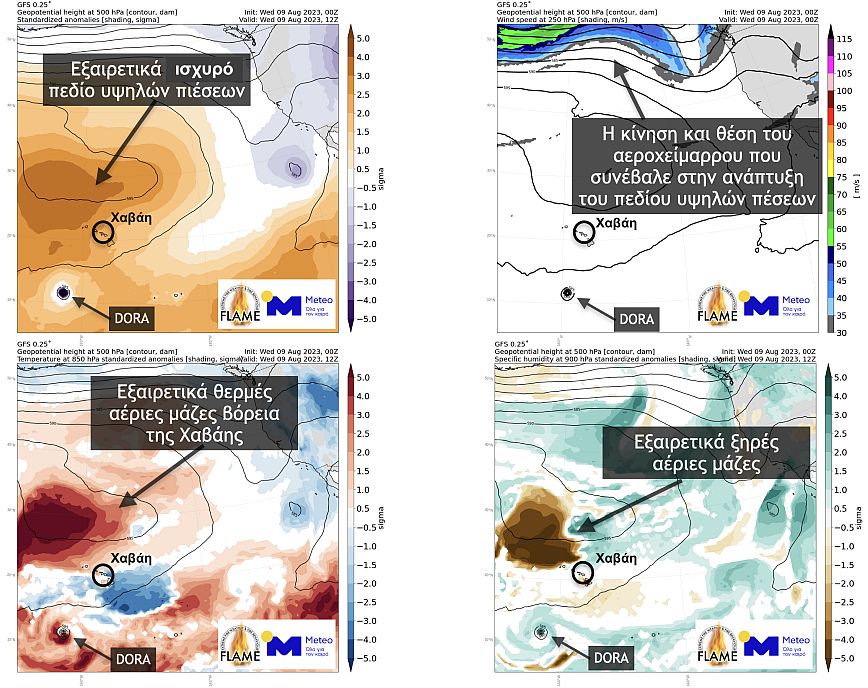 Η ανάλυση των διαθέσιμων στοιχείων δείχνει ότι οι πυρομετεωρολογικές συνθήκες κατά τη διάρκεια της εκρηκτικής εξάπλωσης της φωτιάς καθορίστηκαν κύρια από την παρουσία ενός πολύ ισχυρού πεδίου υψηλών πιέσεων στα βόρεια του νησιωτικού συμπλέγματος της Χαβάης (Εικόνα 1). Η παρουσία αυτού του ανώμαλα ισχυρού πεδίου υψηλών πιέσεων είχε ως αποτέλεσμα τη δημιουργία ισχυρής βαροβαθμίδας κατά τη διεύθυνση βορράς-νότος και συνεπακόλουθα την ενίσχυση των Α/ΒΑ ανέμων (αληγείς άνεμοι). Πνέοντας με θυελλώδεις εντάσεις πάνω από το όρος Mauna Kahalawai, οι Α/ΒΑ άνεμοι έδρασαν ως καταβάτες στην υπήνεμη πλευρά του όρους, εκεί όπου βρίσκεται η πόλη Lahaina. Εξαναγκαζόμενοι από την τοπογραφία να κινηθούν “κατηφορικά” στην υπήνεμη πλευρά, οι Α/ΒΑ καθίστανται ακόμη περισσότερο θερμοί και ξηροί, συνεισφέροντας καθοριστικά στην ακραία ξήρανση της καύσιμης ύλης και επομένως στην αύξηση της ευκολίας ανάφλεξης. Επιπροσθέτως, η συνοπτική κυκλοφορία που περιγράφηκε προηγούμενα, με την παρουσία του πολύ ισχυρού πεδίου υψηλών πιέσεων, είχε ως αποτέλεσμα και την μεταφορά στην επιφάνεια θερμού και ξηρού αέρα από την μέση και κατώτερη τροπόσφαιρα (Εικόνα 1), στοιχείο που συνεισέφερε στη δημιουργία περιβάλλοντος εξαιρετικά ευνοϊκού για την εκρηκτική εξάπλωση και συμπεριφορά της φωτιάς. Συμπερασματικά, η εκρηκτική εξάπλωση της πυρκαγιάς στη νήσο Maui καθοδηγήθηκε κύρια από την επικράτηση πολύ ισχυρών (θυελλωδών), θερμών και ξηρών ανέμων λόγω της επικρατούσας συνοπτικής κυκλοφορίας.