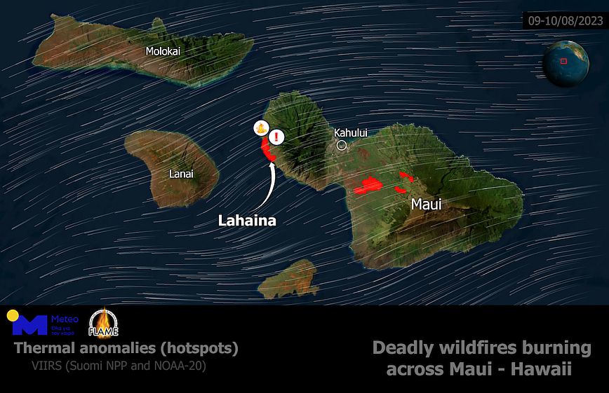 Η πυρκαγιά που έπληξε τη νήσο Μάουι της Χαβάης, ισοπεδώνοντας κυριολεκτικά την ιστορική πόλη της Λαχάινα και προκαλώντας έως σήμερα (Δευτέρα, 14.08.2023) το θάνατο περισσότερων από 90 ανθρώπων, αποτελεί τη φονικότερη πλέον πυρκαγιά των τελευταίων 100 ετών στην ιστορία των ΗΠΑ. Με βάση τις διαθέσιμες πληροφορίες, η πυρκαγιά ξέσπασε τις πρώτες πρωινές ώρες της Τρίτης 8 Αυγούστου 2023, στις πλαγιές του όρους Mauna Kahalawai, ανατολικά της πόλης Lahaina και έως νωρίς το πρωί (09:00 τοπική ώρα) είχε τεθεί υπό έλεγχο. Ωστόσο, το μεσημέρι της ίδιας ημέρας (08.08.2023, 15:00 τοπική ώρα) αναφέρθηκε αναζωπύρωση της φωτιάς, με τους θυελλώδεις ανατολικούς ανέμους να οδηγούν στην εκρηκτική της εξάπλωση και συμπεριφορά. Σύμφωνα με τις αναφορές που υπάρχουν, μέσα σε λιγότερο από 3 ώρες η φωτιά είχε φτάσει στην ακτή, καίγοντας πλέον εντός του αστικού ιστού της πόλης Lahaina.
