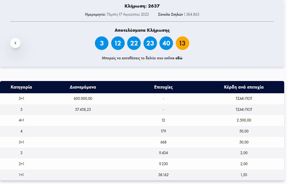 Απόψε Πέμπτη 17 Αυγούστου 2023, στην κλήρωση 2637 του Τζόκερ του ΟΠΑΠ, θα μοιραστούν στους τυχερούς της πρώτης κατηγορίας τουλάχιστον 600.000 ευρώ.