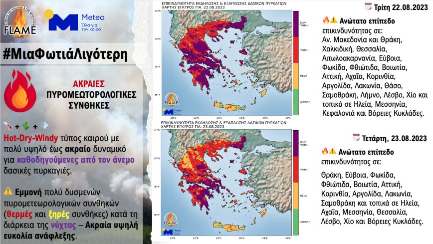 Για την Τετάρτη 23.08.2023, ανώτατο επίπεδο επικινδυνότητας εκδήλωσης και εξάπλωσης δασικών πυρκαγιών αναμένουμε σε Θράκη, Εύβοια, Φωκίδα, Φθιώτιδα, Βοιωτία, Αττική, Κορινθία, Αργολίδα, Λακωνία, Σαμοθράκη και τοπικά σε Ηλεία, Αχαΐα, Μεσσηνία, Θεσσαλία, Λέσβο, Χίο και Βόρειες Κυκλάδες.