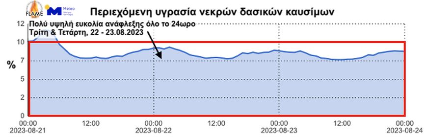 «Είναι πολύ σημαντικό να τονιστεί ότι από την ανάλυση των διαθέσιμων προγνωστικών στοιχείων προκύπτει ότι σε ορισμένες περιοχές της χώρας μας, οι ακραίες πυρομετεωρολογικές συνθήκες θα επιμείνουν καθόλη τη διάρκεια του 24ώρου, τόσο την Τρίτη όσο και την Τετάρτη (22 – 23.08.2023). Όπως χαρακτηριστικά φαίνεται στα επόμενα δύο διαγράμματα, ο πυρομετεωρολογικός δείκτης Hot-Dry-Windy για ένα τυχαίο σημείο της Αττικής δε φαίνεται να υποχωρεί σημαντικά (εμμονή ακραίων πυρομετεωρολογικών συνθηκών) έως και τα μεσάνυχτα της Τετάρτης 23.08.2023, ενώ αντίστοιχα, η περιεχόμενη υγρασία των νεκρών δασικών καυσίμων θα παραμείνει σε τιμές μικρότερες του 10 %, οι οποίες υποδεικνύουν πολύ υψηλή ευκολία ανάφλεξης. Αντίστοιχες συνθήκες με την Αττική (εμμονή ακραίων πυρομετεωρολογικών συνθηκών όλο το 24ωρο) αναμένουμε επίσης σε Ν. Φωκίδα, Δ. Βοιωτία και κατά τόπους σε Αχαΐα, Κορινθία, Αργολίδα, Λακωνία και Σαμοθράκη. Η εμμονή των ακραίων πυρομετεωρολογικών συνθηκών κατά τη διάρκεια των νυχτερινών ωρών αναμένεται να δυσχαιράνει σημαντικά τον έλεγχο τυχόν δασικών πυρκαγιών που εκδηλωθούν στις παραπάνω περιοχές», τονίζεται στη σχετική προειδοποίηση.