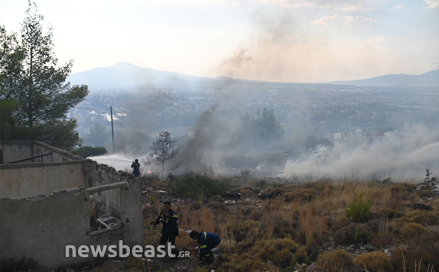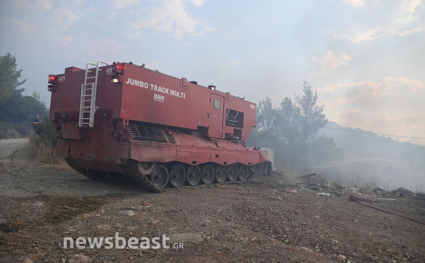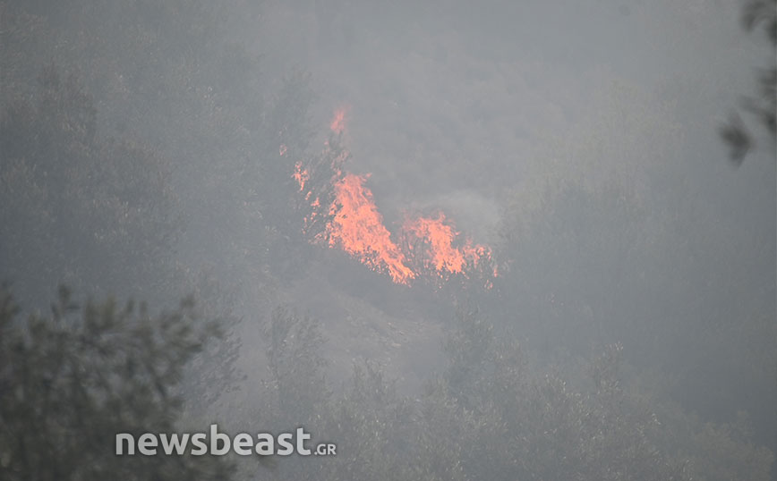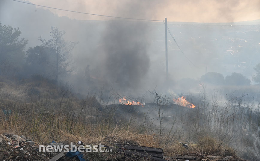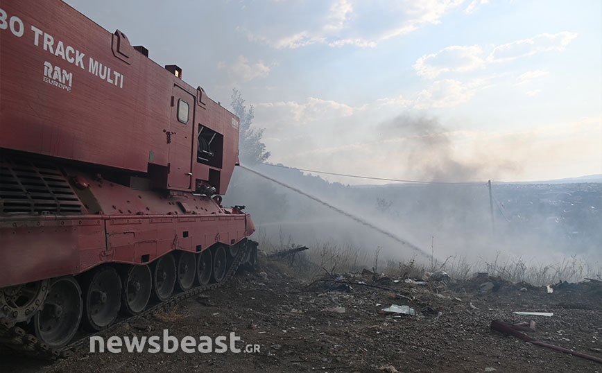 Όπως φαίνεται στις εικόνες που κατέγραψε ο φωτογραφικός φακός του Newsbeast από το στρατόπεδο Καποτά στις 8:30 την Τετάρτη (23/8) οι φλόγες είναι χαμηλά στο βουνό και πολύ κοντά σε κατοικίες.