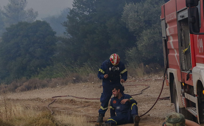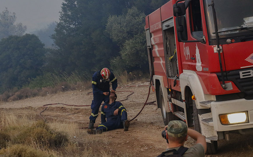 Στις φωτογραφίες που πρακτορείου Intime που τράβηξε ο φωτογράφος Κώστας Καρατζάς φαίνεται ένας πυροσβέστης που βάζει κολλύριο σε συνάδελφό του που έχει καθίσει στο έδαφος.