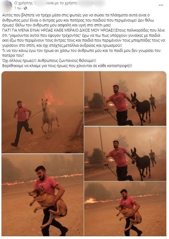 «Αυτός που βλέπετε να τρέχει μέσα στις φωτιές για να σώσει τα πλάσματα αυτά είναι ο άνθρωπος μου! Είναι ο άντρας μου και πατέρας του παιδιού που περιμένουμε! Δεν θέλω ήρωες! Θέλω τον άνθρωπό μου ασφαλή και υγιή στο σπίτι μας! ΓΙΑΤΊ ΓΙΑ ΜΈΝΑ ΕΊΝΑΙ ΉΡΩΑΣ ΚΆΘΕ ΜΈΡΑ!Ο ΔΙΚΟΣ ΜΟΥ ΉΡΩΑΣ!!!