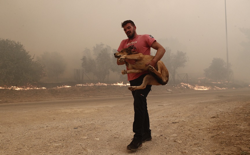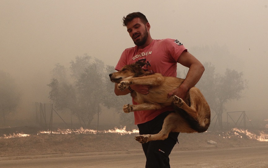 Τα τελευταία 24ωρα οι φωτογραφίες (EUROKINISSI) ενός νεαρού άνδρα που με κίνδυνο της ζωής του, ρίχνεται στη φωτιά που κακακαίει την Πάρνηθα κρατώντας στην αγκαλιά του κάποια σκυλιά προκειμένου να τα σώσει έχουν κατακλύσει τα μέσα κοινωνικής δικτύωσης.