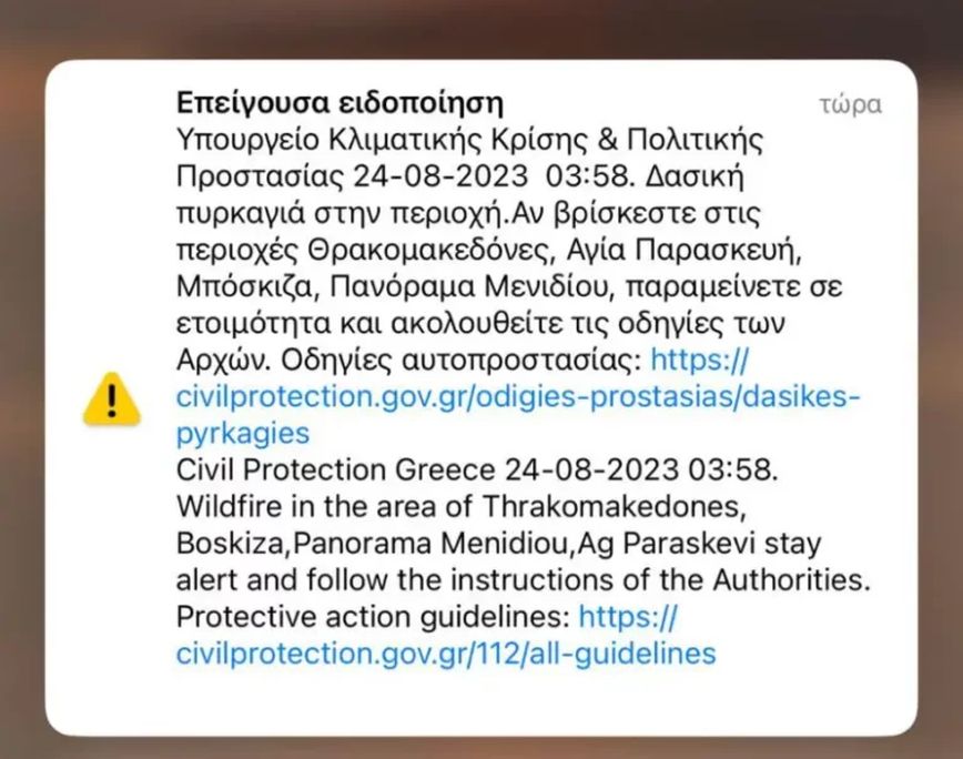 Μήνυμα εστάλη τη νύχτα από το 112 στους κατοίκους των περιοχών: Θρακομακεδόνες, Μπόσκιζα και Πανόραμα Μενιδίου να βρίσκονται σε ετοιμότητα.