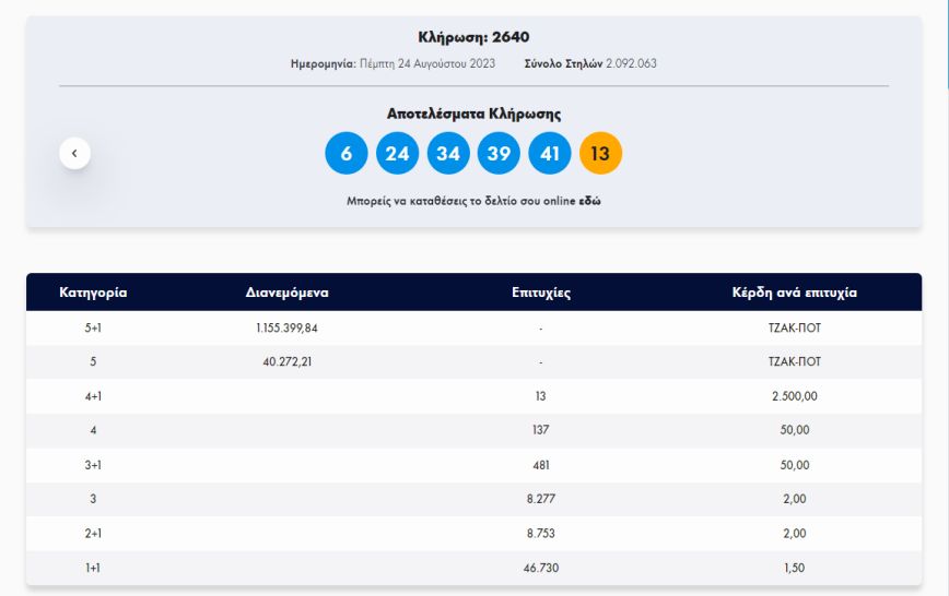 Οι τυχεροί αριθμοί λοιπόν, στη σημερινή κλήρωση Τζόκερ είναι οι εξής: 6, 24, 34, 39, 41 και Τζόκερ ο αριθμός: 13