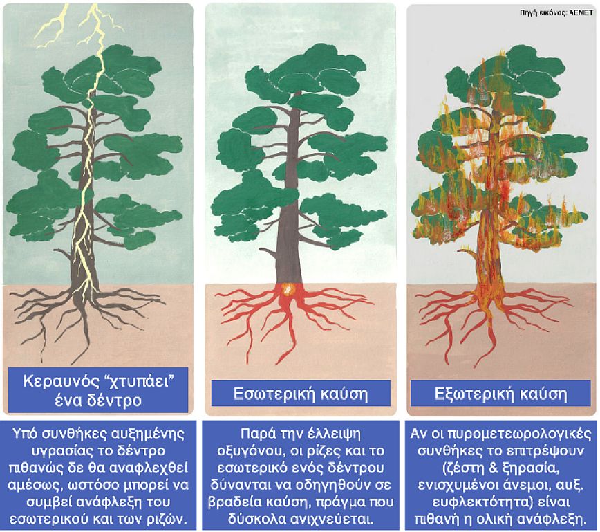 Η Εικόνα 1 παρουσιάζει απλουστευμένα ένα εννοιολογικό μοντέλο περιγραφής της διεργασίας ανάφλεξης της δασικής καύσιμης ύλης από πτώση κεραυνού. Εάν υποθέσουμε ότι ένας κεραυνός «χτυπά» ένα δέντρο, το ηλεκτρικό του φορτίο διαπερνά τον πυρήνα του δέντρου και φτάνει μέχρι τις ρίζες του. Εάν η περιεχόμενη υγρασία του δέντρου είναι υψηλή, δε θα συμβεί αμέσως ανάφλεξη. Παρόλα αυτά, το κατώτερο τμήμα του δέντρου και οι ρίζες του μπορούν να αναφλεχθούν και να συντηρήσουν καύση, ακόμα και χωρίς την παρουσία άφθονου οξυγόνου. Η «εσωτερική» αυτή καύση είναι ασθενής και εξελίσσεται με αργό ρυθμό, ενώ δεν είναι εύκολα ανιχνεύσιμη δίχως τη χρήση εξειδικευμένων θερμικών καμερών ή άλλων, αντίστοιχων τεχνικών τηλεπισκόπησης. Σε περίπτωση που οι πυρομετεωρολογικές συνθήκες είναι ευνοϊκές, η καύση στο εσωτερικό και τις ρίζες του δέντρου μπορεί να επεκταθεί στο εξωτερικό, οδηγώντας τελικά στην έναρξη μίας δασικής πυρκαγιάς.