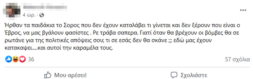 Ο άντρας που φέρεται να ανάρτησε αρχικά το βίντεο σε ανάρτησή του στο Facebook στη συνέχεια έκανε λόγο για «τα παιδάκια του Σόρος» που «δεν ξέρουν πού είναι ο Έβρος» και ήρθαν να τους «βγάλουν φασίστες».