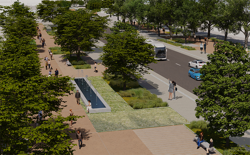 Οι χώροι στους οποίους θα δημιουργηθούν οι κεντρικές πλατείες και τα πλατώματα που θα φιλοξενούν αναψυκτήρια, θα είναι ελάχιστες με έμφαση στη χρήση βιοκλιματικών και φιλικών προς το περιβάλλον υλικών, που χαρακτηρίζονται τόσο από υδατοδιαπερατότητα, όσο και από φυσικότητα.