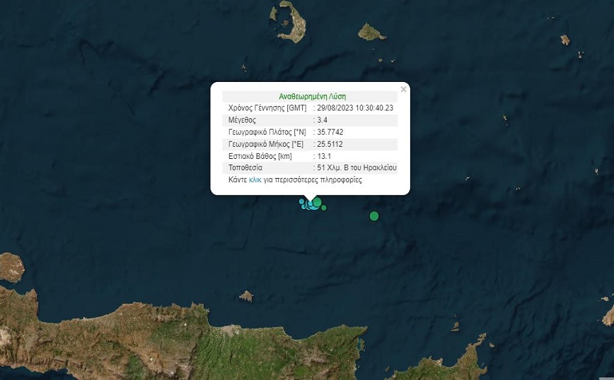 Σεισμική δόνηση, 3,4 βαθμών της Κλίμακας Ρίχτερ, σημειώθηκε βόρεια της Κρήτης. Το εστιακό βάθος, σύμφωνα με το Γεωδυναμικό Ινστιτούτο Αθηνών, εντοπίζεται στα 13 χιλιόμετρα, ενώ το επίκεντρο 51 χιλιόμετρα βόρεια του Ηρακλείου.