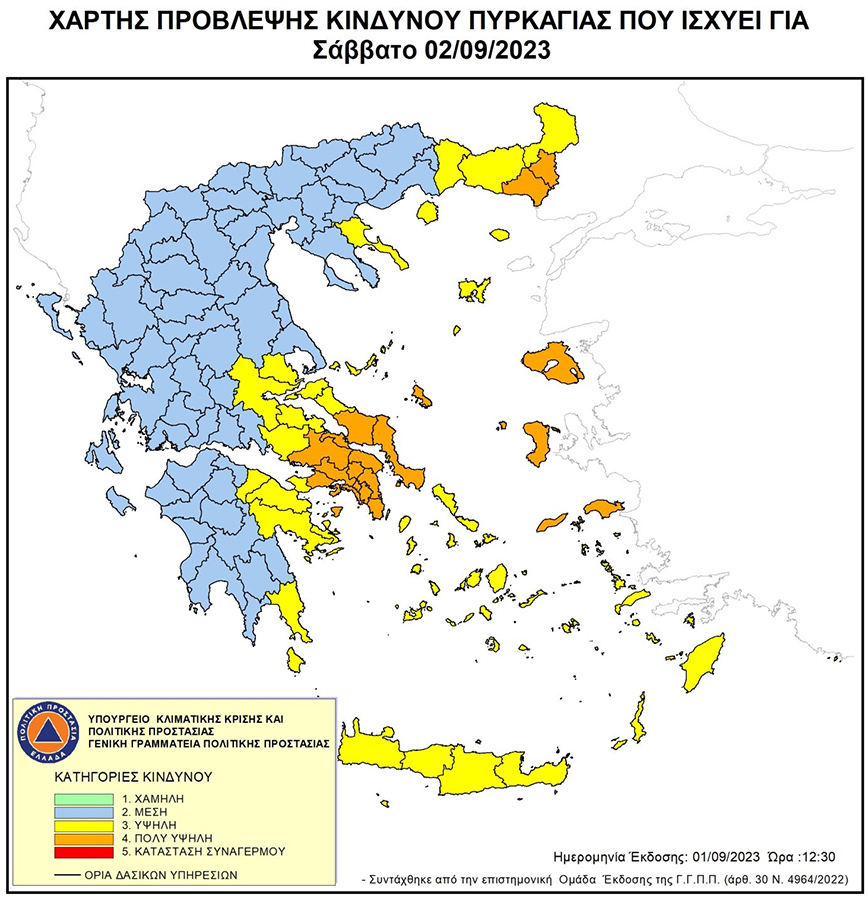 Σύμφωνα με το Χάρτη Πρόβλεψης Κινδύνου Πυρκαγιάς που εκδίδει η Γενική Γραμματεία Πολιτικής Προστασίας του Υπουργείου Κλιματικής Κρίσης & Πολιτικής Προστασίας (civilprotection.gov.gr), για αύριο Σάββατο 02 Σεπτεμβρίου 2023, προβλέπεται πολύ υψηλός κίνδυνος πυρκαγιάς (κατηγορία κινδύνου 4) για τις εξής περιοχές: