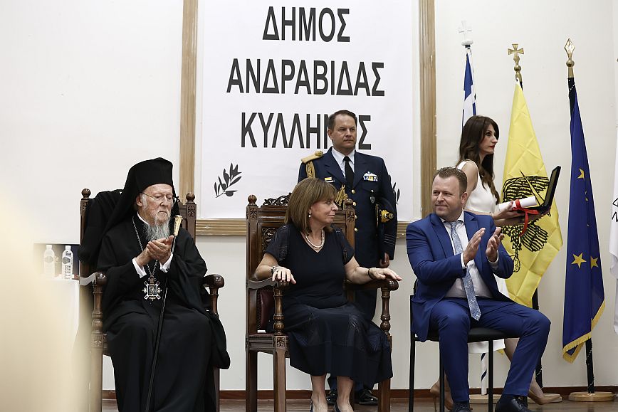 Στις 11:00 η κυρία Σακελλαροπούλου και ο Οικουμενικός Πατριάρχης κ.κ. Βαρθολομαίος βρέθηκαν στον Ιερό Ναό Ισαποστόλων Κωνσταντίνου και Ελένης στην Ανδραβίδα για να παρακολουθήσουν την επίσημη δοξολογία και στη συνέχεια μετέβησαν στο Δημαρχείο της πόλης, όπου πραγματοποιήθηκε η τελετή ανακήρυξής τους σε Επίτιμους Δημότες Δήμου Ανδραβίδας-Κυλλήνης.