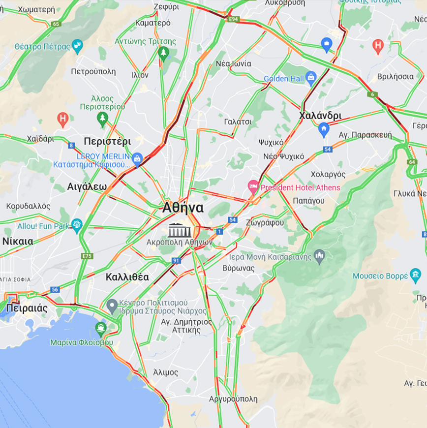 Η κατάσταση είναι δύσκολη σε πολλούς δρόμους της Αττικής, όπως φαίνεται και στον παρακάτω χάρτη…