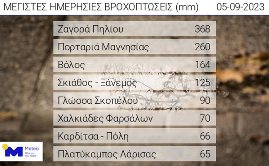 Σύμφωνα με το δίκτυο αυτόματων μετεωρολογικών σταθμών του Εθνικού Αστεροσκοπείου Αθηνών / Meteo.gr, στην περιοχή της Ζαγοράς από τη Δευτέρα 04/09 έως και τις πρωινές ώρες της Τρίτης 05/09 (08:20) έχουν καταγραφεί 516 mm βροχής.