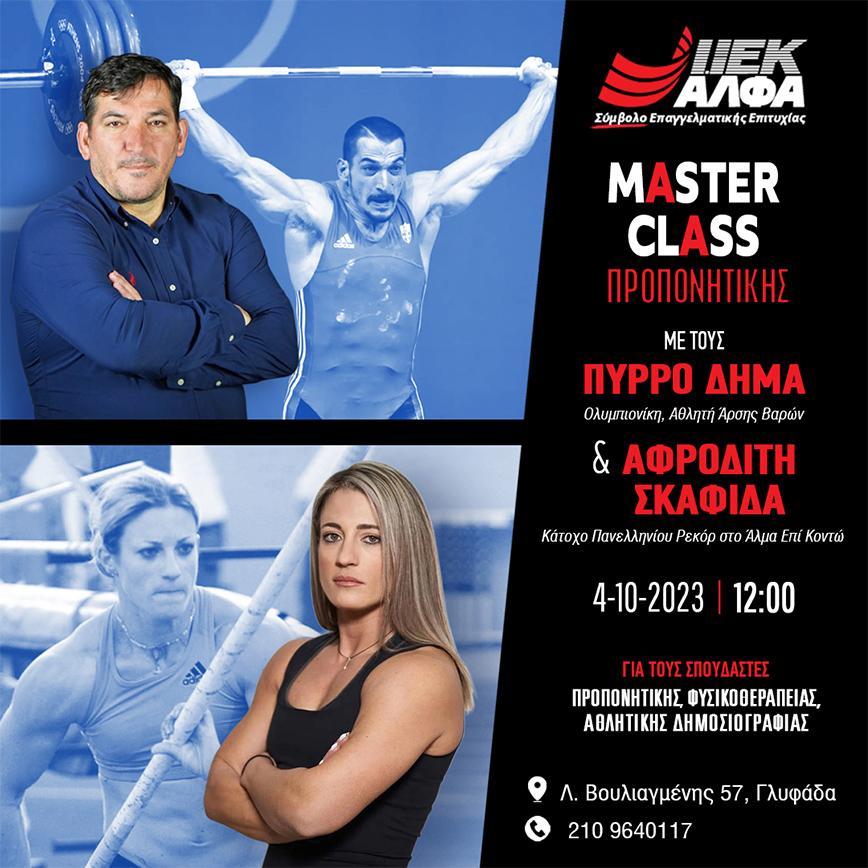 Δυναμικό comeback για τη νέα ακαδημαϊκή χρονιά κάνει ο Τομέας Προπονητικής του ΙΕΚ ΑΛΦΑ Γλυφάδας, διοργανώνοντας Δωρεάν MasterClass με ελεύθερη είσοδο, με εισηγητές τον Ολυμπιονίκη της άρσης βαρών & κορυφαίο Έλληνα αθλητή ΠΥΡΡΟ ΔΗΜΑ και την αθλήτρια στο άλμα επί κοντώ ΑΦΡΟΔΙΤΗ ΣΚΑΦΙΔΑ (κάτοχο του Πανελληνίου Ρεκόρ, με την 4η καλύτερη επίδοση στην Ευρώπη και 9η στον κόσμο)!