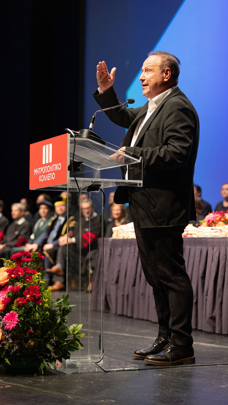 Στην Τελετή Αποφοίτησης που έλαβε χώρα στην κατάμεστη αίθουσα «Φίλων της Μουσικής» στο Μέγαρο Μουσικής Θεσσαλονίκης, κεντρικός ομιλητής ήταν ο νεοεκλεγείς Δήμαρχος, κ. Στέλιος Αγγελούδης. Στον χαιρετισμό του προς τους απόφοιτους, ανέφερε: «Εσείς, οι απόφοιτοι του Μητροπολιτικού Κολλεγίου, ενός από τα πιο σύγχρονα και δυναμικά ακαδημαϊκά ιδρύματα της Νοτιοανατολικής Ευρώπης, είχατε την ευκαιρία και την τύχη να φοιτήσετε σε έναν πρωτοπόρο εκπαιδευτικό φορέα, που τολμά και επιδιώκει το συνεχή εκσυγχρονισμό. Ένα Κολλέγιο που σας εξασφάλισε τις καλύτερες δυνατές προϋποθέσεις για την ένταξη στην αγορά εργασίας. Έχετε εφοδιαστεί με όλα τα συστατικά της επιτυχίας: με εμπειρίες, γνώσεις και δεξιότητες που ανοίγουν δρόμους για μια επαγγελματική ή ακαδημαϊκή ευκαιρία. Απαντήστε στις αυξημένες προκλήσεις του σήμερα με αποφασιστικότητα, τόλμη και προσήλωση στους στόχους που έχετε θέσει. Κερδίστε το μέλλον σας, το μέλλον που δικαιούστε και που είμαι βέβαιος πως σας αξίζει. Αν με ρωτήσετε, ποιο είναι το μυστικό της επιτυχίας, θα σας πω πως μόνο με πολλή δουλειά, επιμονή, σχέδιο και προσήλωση μπορείτε να φτάσετε στην κορυφή. Πιστέψτε στους εαυτούς σας και μη σταματήσετε ποτέ να επιδιώκετε τη γνώση».