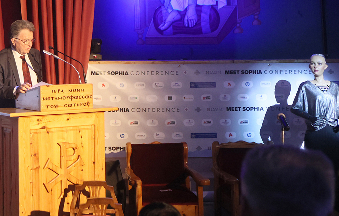 Για τους σκοπούς του εν λόγω συνεδρίου –το οποίο πραγματοποιήθηκε στο Διεθνές Συνεδριακό Κέντρο της Ιεράς Μονής Μεταμορφώσεως στη Ναύπακτο– οι εκπαιδευτικοί φορείς MEDITERRANEAN COLLEGE & ΙΕΚ ΑΛΦΑ έφεραν για πρώτη φορά στην Ελλάδα το πλέον εξελιγμένο και διάσημο ρομπότ Τεχνητής Νοημοσύνης στον πλανήτη: τη SOPHIA!
