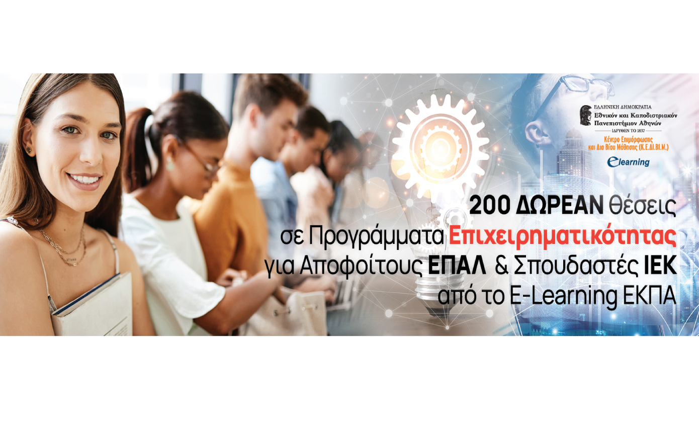 Tο Πρόγραμμα Συμπληρωματικής εξ Αποστάσεως Εκπαίδευσης (E-Learning) του Κέντρου Επιμόρφωσης και Δια Βίου Μάθησης (Κ.Ε.ΔΙ.ΒΙ.Μ.) του ΕΚΠΑ, προσφέρει διακόσιες (200) ΔΩΡΕΑΝ θέσεις για επιμόρφωσησε απόφοιτους Επαγγελματικών Λυκείων (ΕΠΑ.Λ.) και σπουδαστές Ινστιτούτων Επαγγελματικής Κατάρτισης (ΙΕΚ) που έχουν συμπληρώσει το 18ο έτος ηλικίας τους.