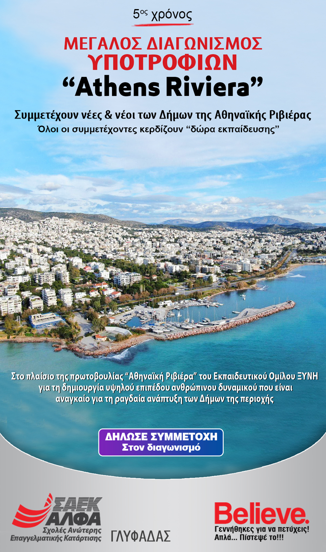 Το ΣΑΕΚ ΑΛΦΑ Γλυφάδας που υπερέχει στις Τουριστικές Σπουδές, προκηρύσσει για 5η συνεχή χρονιά μεγάλο διαγωνισμό για τις “Athens Riviera Scholarships”, στο πλαίσιο της μεγάλης πρωτοβουλίας του Εκπαιδευτικού Ομίλου ΞΥΝΗ “Athens Riviera”.