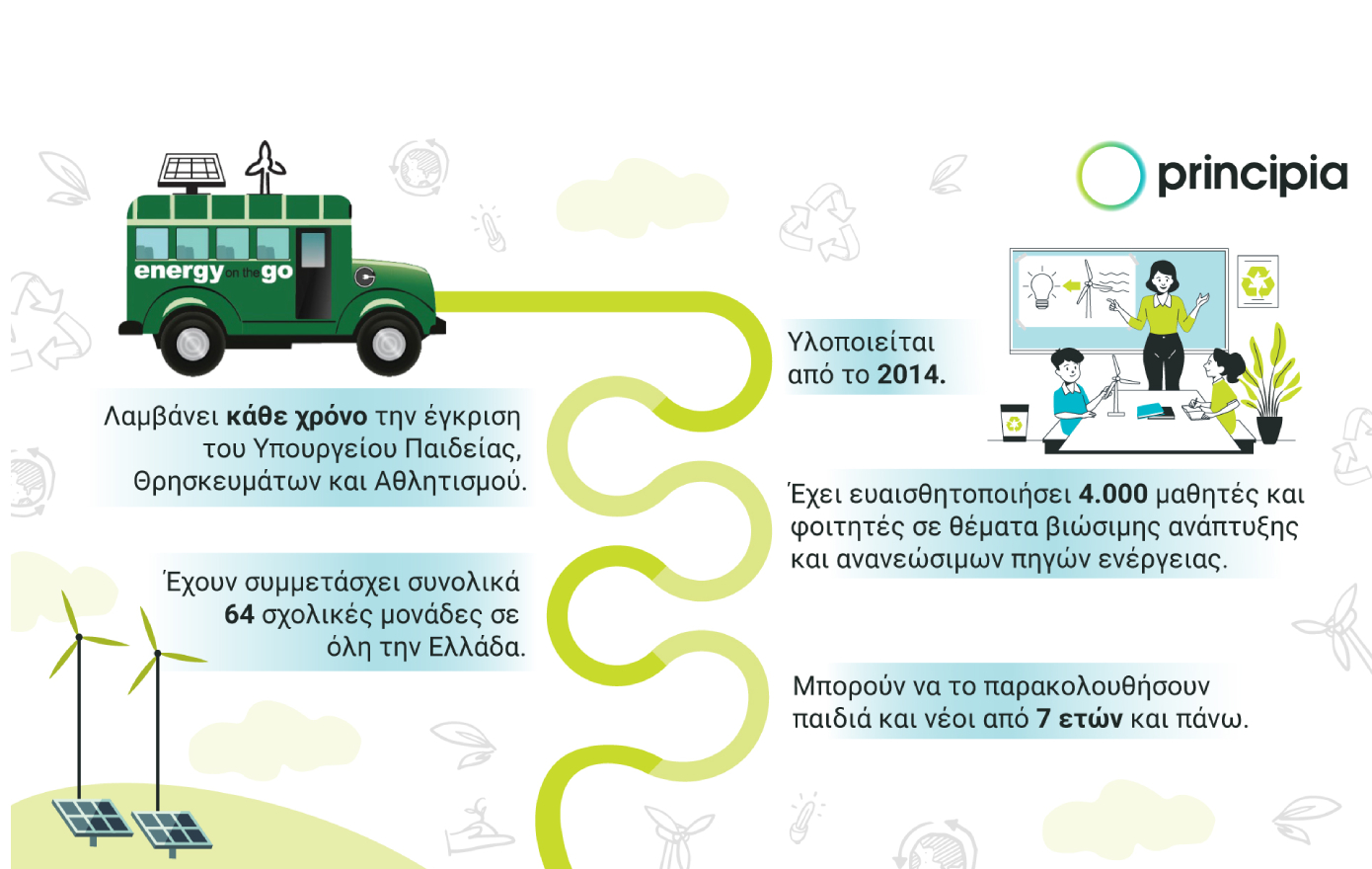 Η Principia, στο πλαίσιο της δέσμευσής της για τη δημιουργία ενός βιώσιμου μέλλοντος, ολοκλήρωσε με επιτυχία για ακόμη μία χρονιά το καινοτόμο εκπαιδευτικό πρόγραμμα “Energy on the Go” το οποίο φέρει την έγκριση του Υπουργείου Παιδείας, Θρησκευμάτων και Αθλητισμού και στοχεύει στην ενημέρωση και ευαισθητοποίηση μαθητών και φοιτητών σε θέματα βιώσιμης ανάπτυξης και ανανεώσιμων πηγών ενέργειας (ΑΠΕ). Συνολικά, από την έναρξη του προγράμματος το 2014, έχουν συμμετάσχει στο πρόγραμμα πάνω από 4.000 μαθητές και φοιτητές.