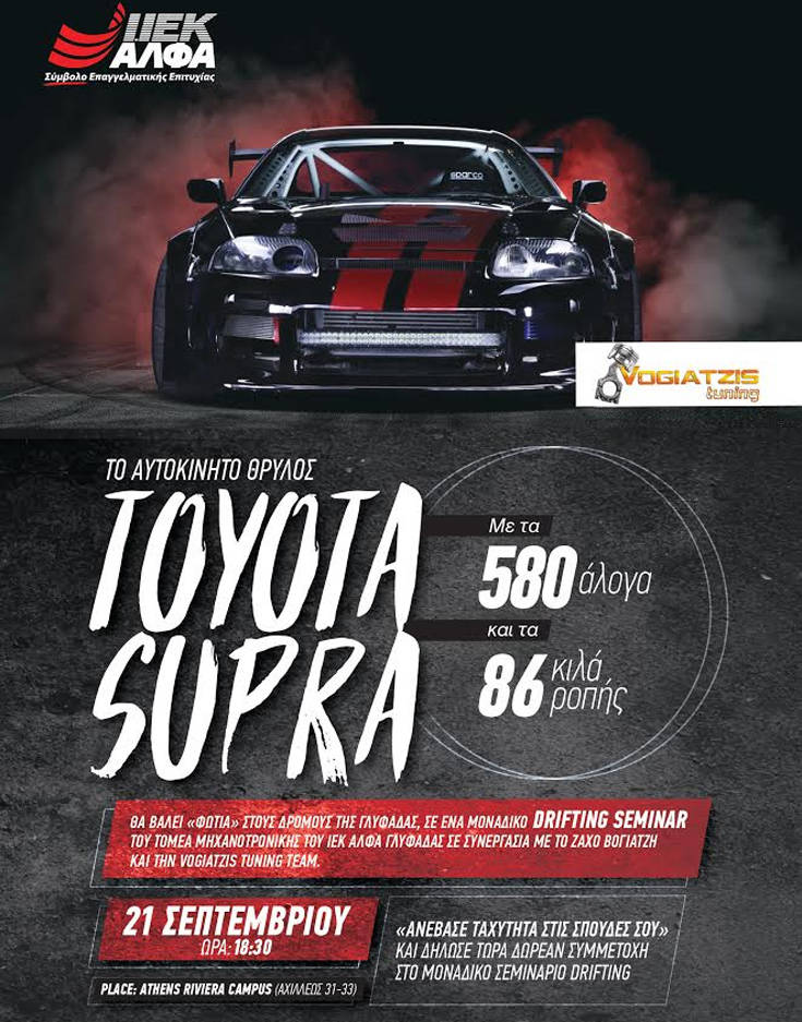 Θέλεις να μπεις με… γκάζια στον κλάδο της Μηχανολογίας και δεν έχεις αποφασίσει ακόμα πού να σπουδάσεις; Έλα στο Open Day Μηχανολογίας του ΙΕΚ ΑΛΦΑ Γλυφάδας την Παρασκευή 21 Σεπτεμβρίου στις 18.30 και πάρε μέρος δωρεάν στο μοναδικό drifting seminar του κορυφαίου ΙΕΚ των Νοτίων Προαστίων, το οποίο θα πραγματοποιηθεί σε συνεργασία με τον Ζάχο Βογιατζή και την Vogiazis Tuning! Κάνε την ΑΛΦΑ επιλογή για σπουδές Μηχανοτρονικής, παρακολουθώντας το θρυλικό TOYOTA SUPRA με τα 580 άλογα και τα 86 κιλά ροπής να βάζει «φωτιά» στην άσφαλτο! Οι νέοι σπουδαστές των ειδικοτήτων «Τεχνικός Μηχανοτρονικής» και «Εκπαιδευτής Υποψηφίων Οδηγών Αυτοκινήτων & Μοτοσυκλετών» του ΙΕΚ ΑΛΦΑ σε Αθήνα, Πειραιά και Γλυφάδα, καθώς και νέοι που αγαπούν τη Μηχανολογία, αλλά δεν έχουν αποφασίσει ακόμα πού θα σπουδάσουν, θα έχουν την ευκαιρία να ζήσουν μια μοναδική εμπειρία και να ενημερωθούν από ειδικούς για το επάγγελμα που ονειρεύονται. Το Open Day θα πραγματοποιηθεί στο σύγχρονο και πρόσφατα ανακαινισμένο campus του ΙΕΚ ΑΛΦΑ στη Γλυφάδα, επί της Αχιλλέως 31-33. ΙΕΚ ΑΛΦΑ -Σπουδές ΣΗΜΕΡΑ, Δουλειά ΑΥΡΙΟ, Επιτυχία ΓΙΑ ΠΑΝΤΑ!