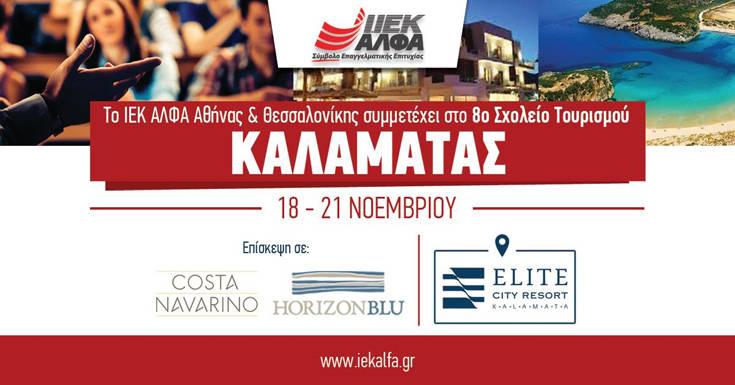 Σε ένα εκπαιδευτικό τετραήμερο γεμάτο σεμινάρια Μαγειρικής, Ζαχαροπλαστικής, Τουρισμού, αλλά και Ομορφιάς, υπό την αιγίδα του Σ.Ε.Τ.Ε. (Σύνδεσμος Ελληνικών Τουριστικών Επιχειρήσεων), θα έχουν το προνόμιο να συμμετάσχουν και φέτος οι σπουδαστές Επισιτισμού, Τουρισμού και Ομορφιάς του ΙΕΚ ΑΛΦΑ, από την Κυριακή 18 Νοεμβρίου έως και την Τετάρτη 21 Νοεμβρίου, στο πλαίσιο του 8ου Σχολείου Τουρισμού Καλαμάτας, στο ξενοδοχείο ELITE CITY RESORT.