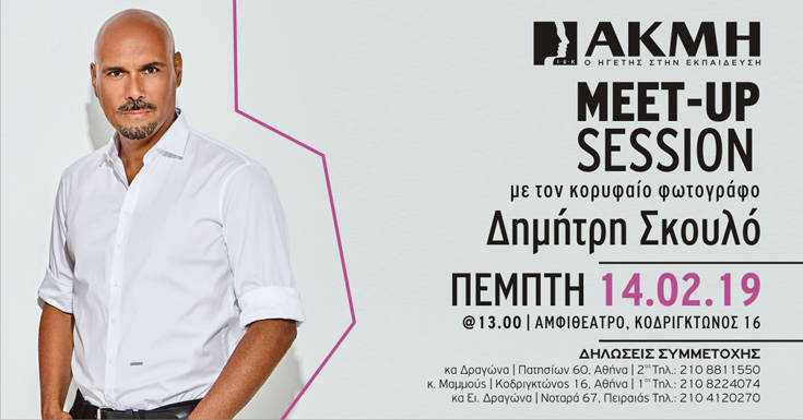 Ο Δημήτρης Σκουλός θα συστηθεί στους σπουδαστές Φωτογραφίας, Μόδας, Επαγγελματικού Μακιγιάζ και Κομμωτικής του ΙΕΚ ΑΚΜΗ σε ένα αποκαλυπτικό Meet – Up Session που θα πραγματοποιηθεί στις εγκαταστάσεις του ΙΕΚ ΑΚΜΗ στην Αθήνα (Κοδριγκτώνος 16) την Πέμπτη 14 Φεβρουαρίου, ώρα 13:00.
