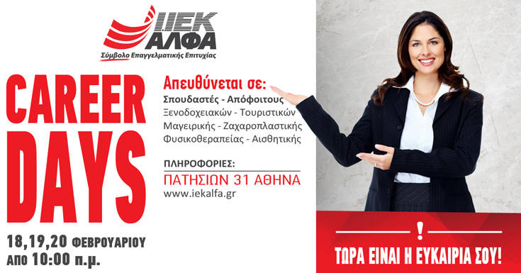Με τη συμμετοχή κορυφαίων ξενοδοχειακών μονάδων, που αναζητούν υποψήφιους συνεργάτες με υψηλό επίπεδο εκπαίδευσης και αναβαθμισμένα επαγγελματικά προσόντα, από τις ειδικότητες Μαγειρικής, Ζαχαροπλαστικής, Τουριστικών, Ξενοδοχειακών, Αισθητικής, Φυσικοθεραπείας, θα πραγματοποιηθούν οι Ημέρες Καριέρας του ΙΕΚ ΑΛΦΑ στην Αθήνα από τις 18 έως και τις 20 Φεβρουαρίου.