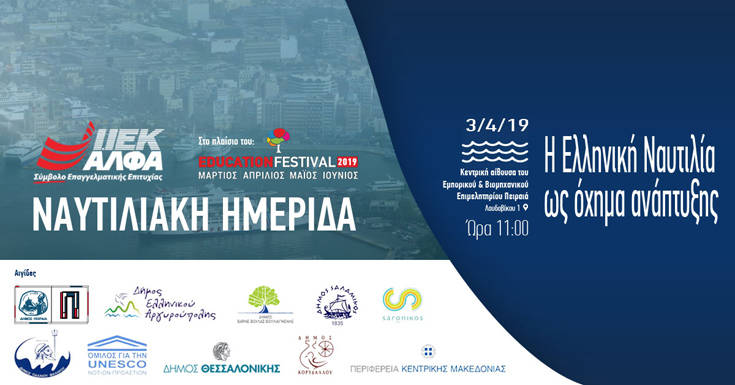 Υπό τις αιγίδες της Περιφέρειας Κεντρικής Μακεδονίας, της UNESCO Νοτίων Προαστίων και 8 μεγάλων Δήμων της χώρας μας (Πειραιά, Σαλαμίνας, Κορυδαλλού, Π. Φαλήρου, Θεσσαλονίκης, Ελληνικού-Αργυρούπολης, Βάρης-Βούλας-Βουλιαγμένης και Σαρωνικού), πραγματοποιείται από τον Τομέα Ναυτιλιακών του ΙΕΚ ΑΛΦΑ Πειραιά η Ημερίδα με θέμα: «Η Ελληνική Ναυτιλία ως όχημα ανάπτυξης», την Τετάρτη 3 Απριλίου στις 11.00, στο Εμπορικό & Βιομηχανικό Επιμελητήριο Πειραιά (ΕΒΕΠ), Λουδοβίκου 1.