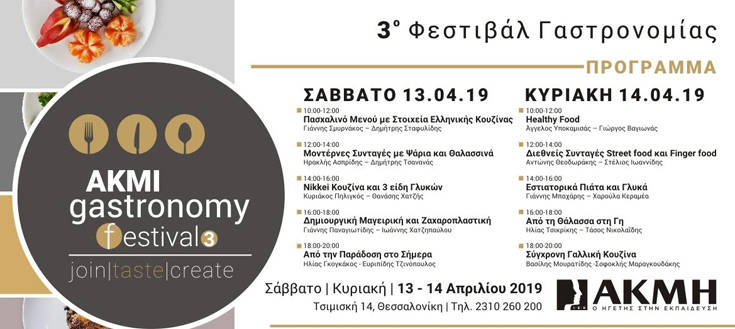Το ΙΕΚ ΑΚΜΗ στη Θεσσαλονίκη επιστρέφει με το τρίτο διήμερο φεστιβάλ γαστρονομίας, που διοργανώνει στις εγκαταστάσεις του, το Σάββατο 13 και την Κυριακή 14 Απριλίου 2019.