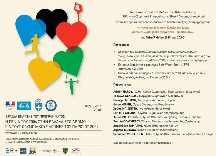 Η Πρεσβεία της Γαλλίας στην Ελλάδα, η Ελληνική Ολυμπιακή Επιτροπή, το Γαλλικό Ινστιτούτο Ελλάδος και η Εθνική Ολυμπιακή Ακαδημία, σας ενημερώνουν σχετικά με την βραδιά έναρξης του προγράμματος «Η γενιά του 2004 στην Ελλάδα στο δρόμο για τους Ολυμπιακούς Αγώνες του Παρισιού 2024» που θα πραγματοποιηθεί στις 7 Μαΐου 2019, στις 20.00 στο Auditorium Theo Angelopoulos του Γαλλικού Ινστιτούτου Ελλάδος, οδός Σίνα 31.