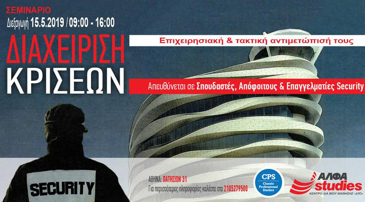 Ο λόγος για το εξειδικευμένο σεμινάριο SECURITY «Crisis Management Operational & tactical measures» (Διαχείριση Κρίσεων -Επιχειρησιακή και τακτική αντιμετώπισή τους), το οποίο διεξάγεται στο κορυφαίο -σε τεχνογνωσία και εμπειρία στον κλάδο της Ασφάλειας- Κέντρο Διά Βίου Μάθησης 2 ΑΛΦΑ studies, στην Αθήνα, την ερχόμενη Τετάρτη 15 Μαϊου και ώρες 09.00-16.00!
