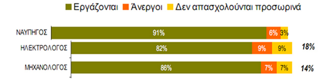 Όσον αφορά τους ηλεκτρολόγους η ανεργία ανέρχεται στο 9% και στους μηχανολόγους στο 7% ενώ για τους ναυπηγούς η ανεργία ήταν λίγο χαμηλότερη και έφθανε το 6%. Να σημειώσουμε ότι τα στοιχεία αφορούν το 2009 έτος που δεν είχε εκδηλωθεί ακόμα η κρίση. Το ποσοστά της ανεργίας έχουν αυξηθεί αφού πολλές βιομηχανίες έχουν κλείσει με αποτέλεσμα πολλοί μηχανολόγοι και ηλεκτρολόγοι να βρεθούν χωρίς δουλειά. Εικάζουμε ότι το ποσοστό ανεργίας κυμαίνεται στο 15-20% για ηλεκτρολόγους και μηχανολόγους.