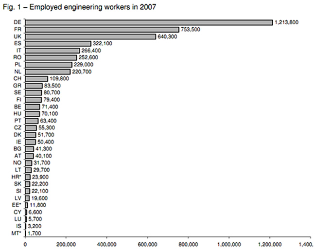 Σύμφωνα με τα στοιχεία του European Engineering Report η Ελλάδα το 2007 βρισκόταν στη 10 η θέση με βάση των αριθμών των μηχανικών όλων των ειδικοτήτων που εργάζονταν. Στην έρευνα αυτή περιλαμβάνεται το σύνολο των μηχανικών και αποδεικνύεται για ακόμη μια φορά η πληθώρα τον επιστημόνων που παράγει η χώρα μας.